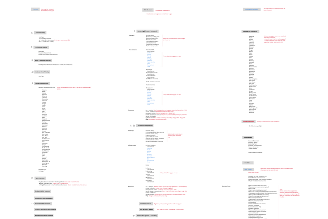 One of my first tasks at Insureon was to assess the Insureon.com ecosystem. I found that it was bloated, as partial redesigns had been initiated throughout the Insureon ecosystem. Content was outdated and vital user information was sprinkled across many pages. There was no clear categorization of pages, or a clear linking pattern. The user journey was a “wild wild west”, lacking a clear navigational structure for our users. The previous partial redesign efforts resulted in many different legacy template designs, and inconsistent code structure on the back end. In the past, various page types were created as one-offs, allowing for a huge number of pages that could not be updated systematically.